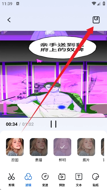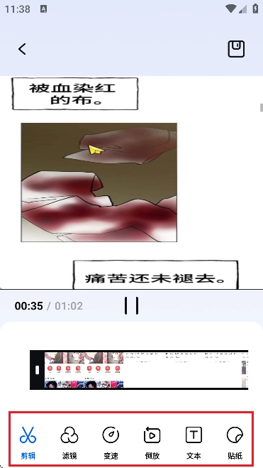 5. 来到编辑器界面,在此能够执行裁剪、添加滤镜、变速、倒放、添加文本、贴纸等操作。