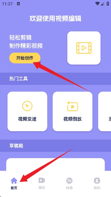 1. 启动豆泡剪辑App,轻点“开始创作”,从而进入视频编辑界面。