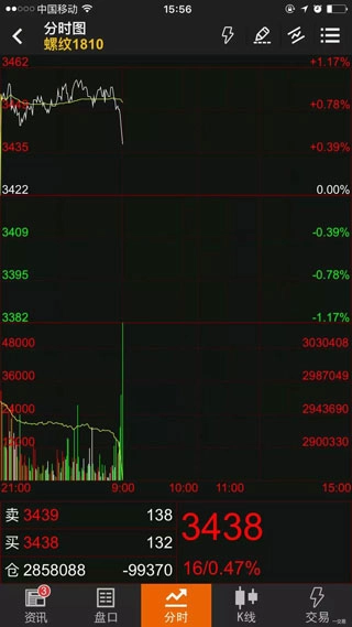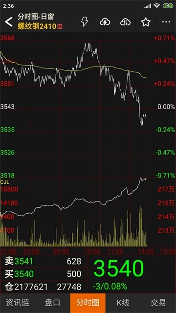 点击合约后,系统默认进入分时走势图。通过分时走势图,投资者能够直观地洞悉当前价格走势,便于清晰了解当天价格的详细动态。此外,投资者还可通过点击下方的“资讯”“盘口”“K线”“交易”选项,轻松切换至相应页面。