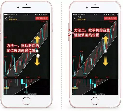 答:处于画线分析使用状态时,点击图表中的画线,线上便会出现白色定位点。点击其中某一个定位点,该定位点即可被激活。此时,可通过以下两种方法对画线进行微调:方法一,拖动已激活的定位点来调整画线位置;方法二,按下手机的音量键以微调画线位置。
