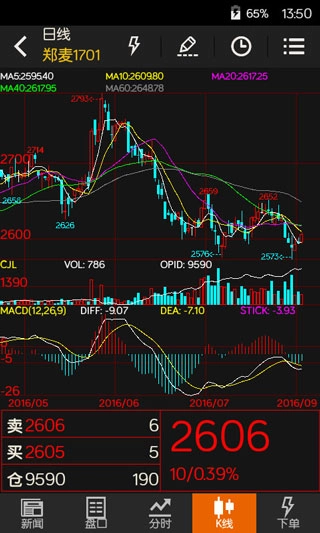 能够直观地查看不同周期的价格变动情况,同时结合幅图指标(该指标可切换不同类型),运用技术分析手段对行情走势展开研判,并且还能够在图表上进行画线操作。