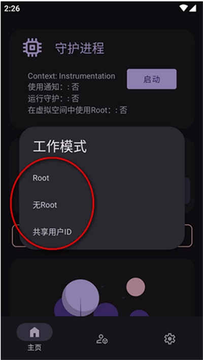 1、打开软件后先要选择工作模式,有root,无root和共享用户id模式。