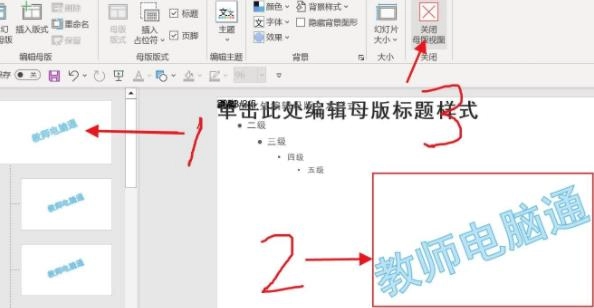 2. 把左侧PPT翻至最顶端,点击第一页。寻找到水印并删除(若母版存在其他水印,也都需一并删除)。完成后点击“关闭”。