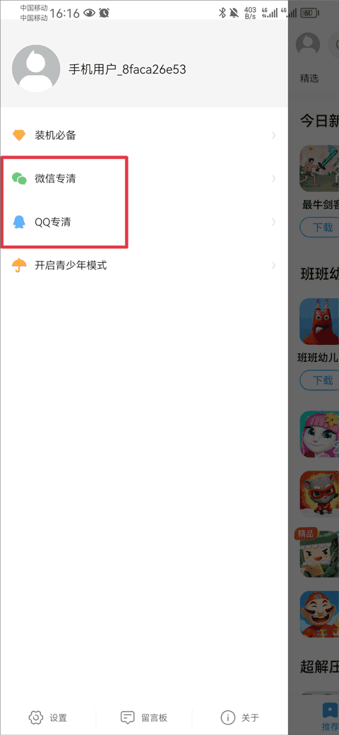 3. 轻点界面左上角,即可进入个人中心,该功能支持对微信、QQ等常用软件执行垃圾清理操作。