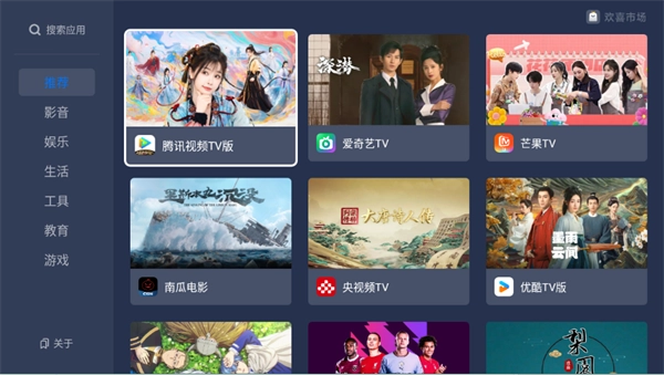 欢喜市场电视版,是专门为智能电视量身打造的应用聚合平台。它拥有海量丰富的应用资源,能够全方位满足不同观众多样化的使用需求。该平台界面设计简洁直观,用户无需复杂操作,就能迅速找到自己心仪的应用。快来体验吧!
