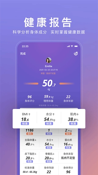 3、适配体脂秤设置,分析并对比用户测量数据,为用户提供健康评估、身心分析及身心建议。