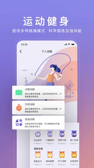 搭配WOLO智能跳绳,设有计时、计数、自由这三种训练模式,还配备16项运动挑战任务,让你充分领略运动带来的欢乐。