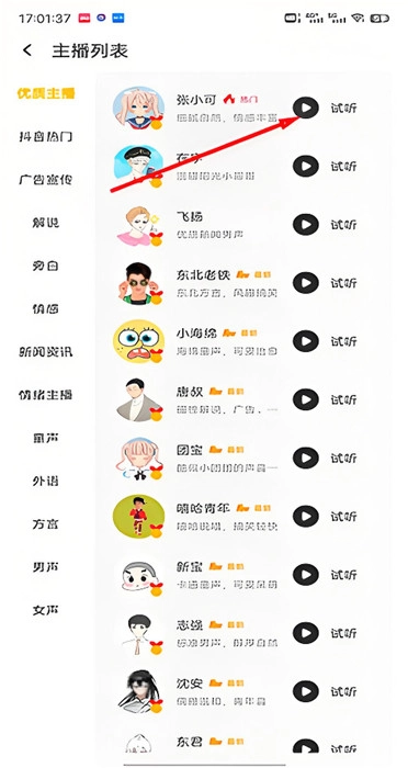 2、用户可在下方的主播选择按钮处,切换不同的配音声音。选好适合的声音后,能够进行试听,以此确认音质与风格。