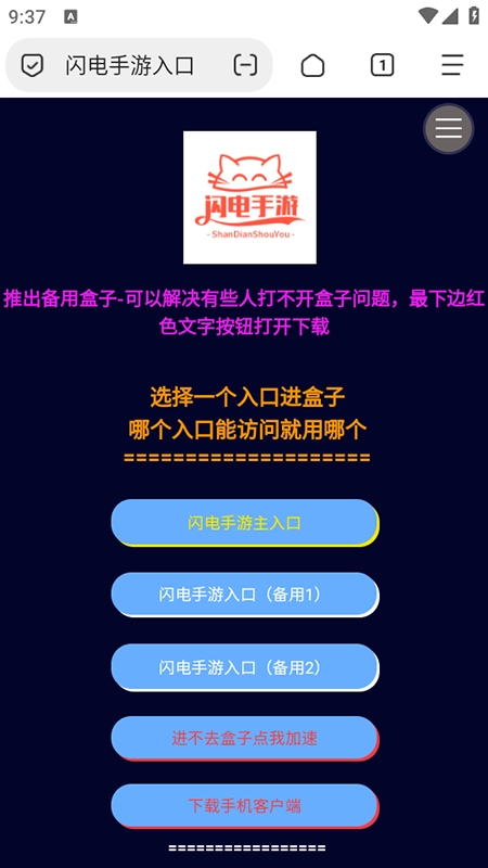 1、于本站安装并开启后,能够选择主入口或者备用入口进入盒子。要是无法进入,点击“进不去盒子点我加速”尝试解决。
