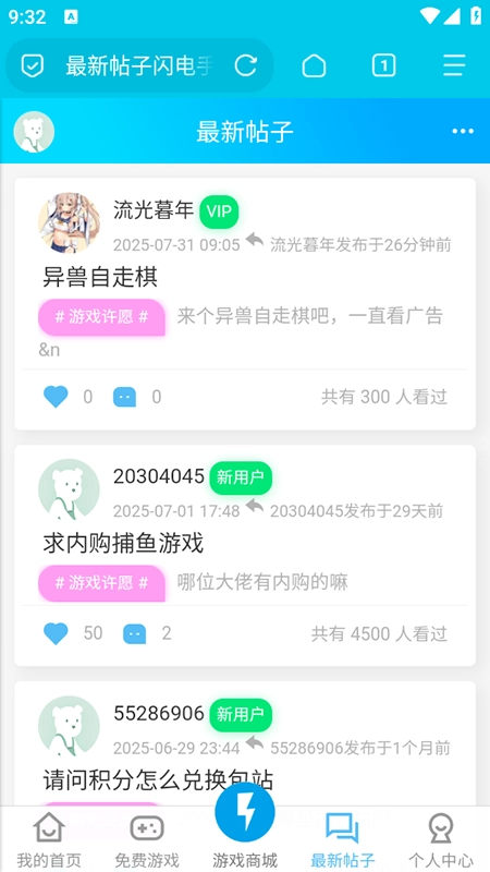 4、来到最新帖子板块,在这里能够发布游戏相关帖子,还能浏览其他玩家分享的内容,同时参与诸如“玩家分享”“聊天交友”等话题的互动交流。