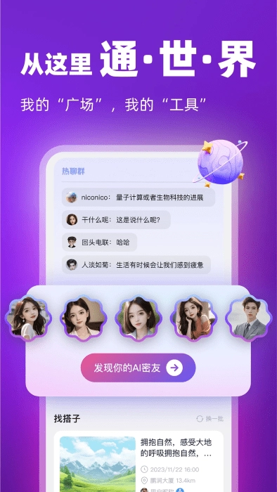 通通是一款基于AI技术打造,融合了娱乐与社交元素的互动软件。在这里,你能通过虚拟模拟,拥有不同性格的AI密友,随时畅快聊天。不仅如此,还能与好友群一同玩游戏,围绕自己感兴趣的话题展开讨论,挖掘身边更多趣事。来通通,开启全新生活方式,快来一起体验吧!