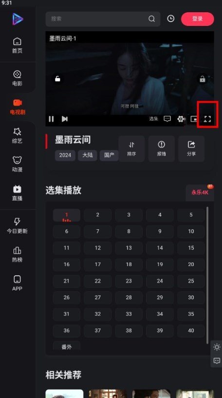 要进入全屏播放页面,只需进入影视播放页面后,点击图中所示的标志。
