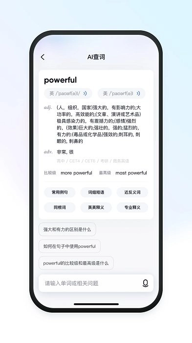 功能再升级!输入关键词时系统会智能关联相关内容,相近词汇的差异能一键清晰对比,常用短语和实用例句也能一次性呈现。