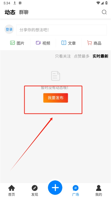 点击广场,在这里可以发布自己的动态内容