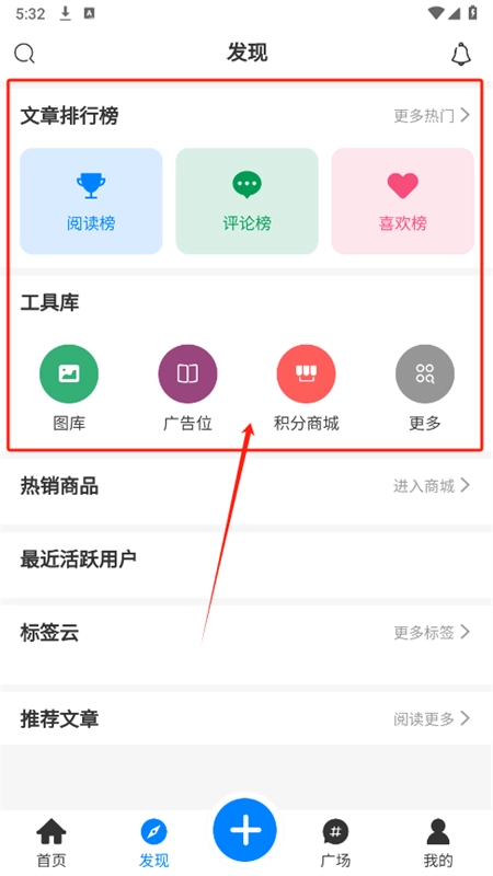 在发现页面可以查看文章排行榜和使用工具库功能