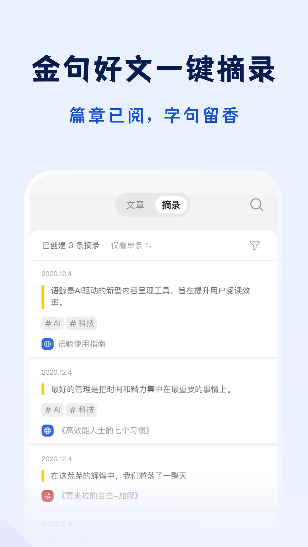 这是一款名为语鲸的AI资讯阅读工具,丰富实用功能供用户探索。它支持一键收藏优质内容中的精彩语句,还能通过关键词快速检索所需信息,操作便捷高效。若您对这款工具感兴趣,欢迎点击体验!