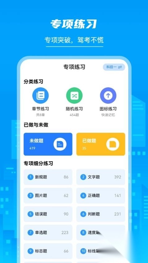 这款专为摩托车驾照备考打造的应用十分实用,海量练习题资源供学习者使用。题目按不同类别精细分类,用户能根据自身情况灵活选择练习内容。系统会自动跟踪记录答错的题目,并将其汇总成专属错题集,方便用户针对性复习,从而帮助用户高效巩固知识点,强化对各类考点的掌握。