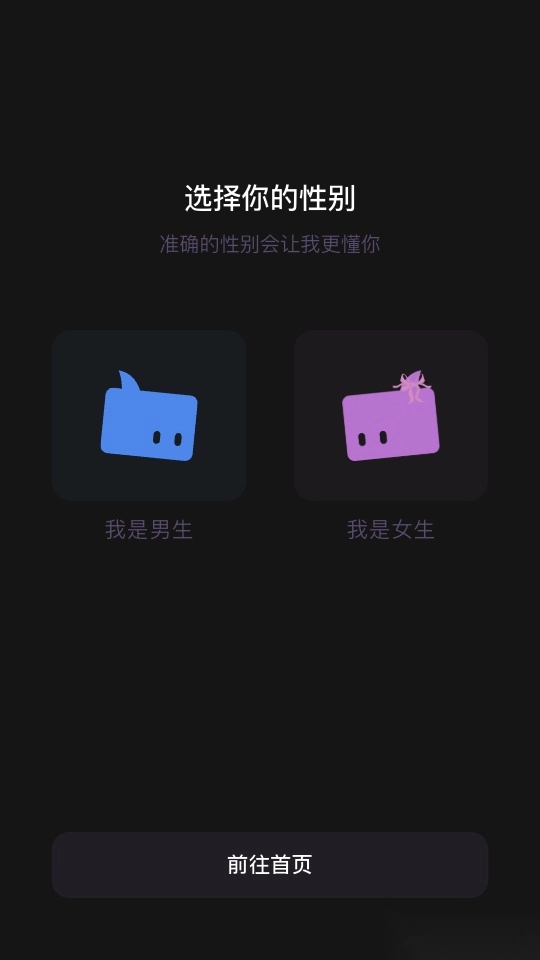 进入性别选择界面选定自身性别后,点击“前往首页”按钮以推进后续操作。