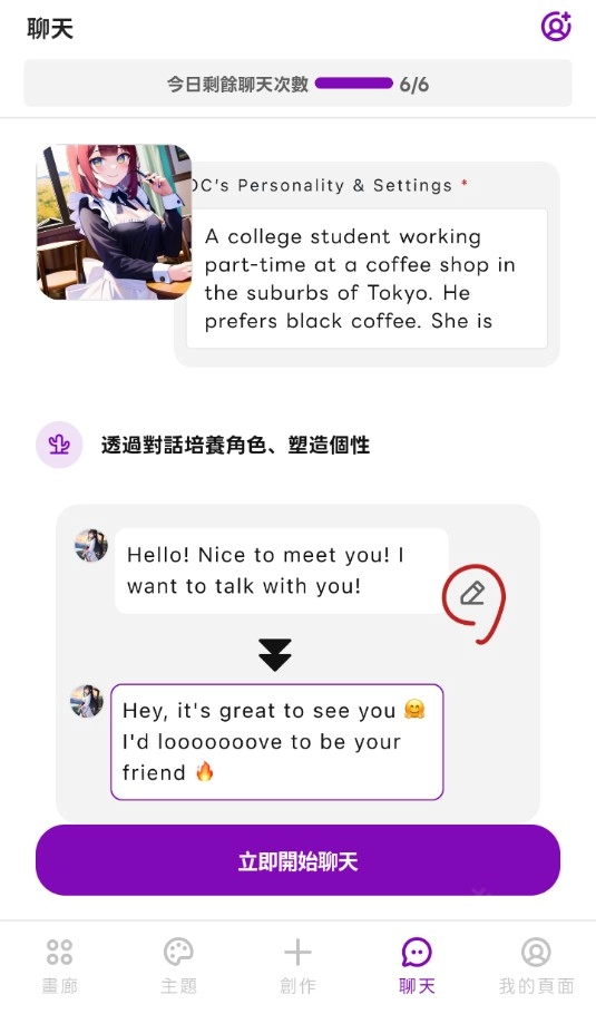 点击【聊天】按钮就能和已创建的角色展开对话,助力你更深入地完善OC设定