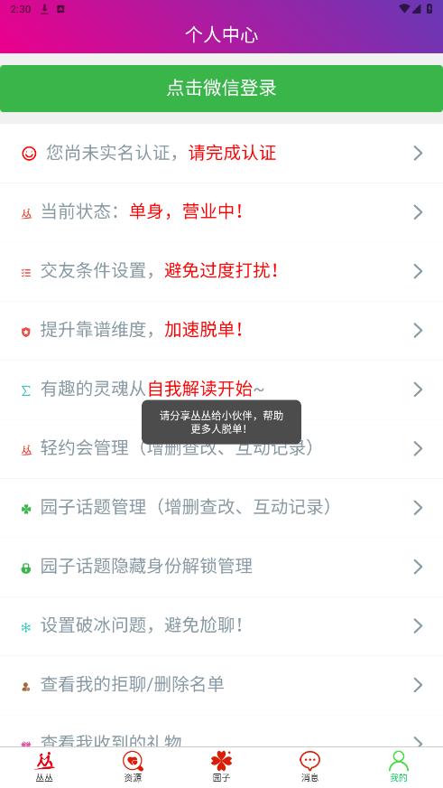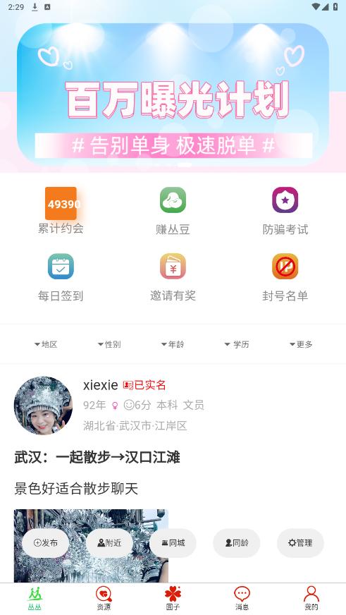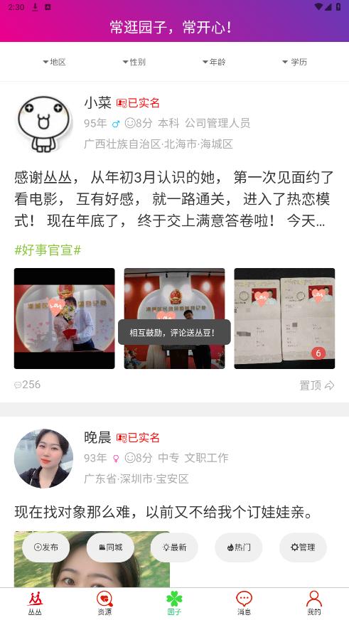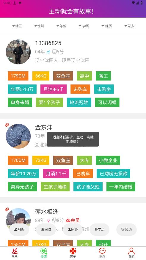 丛丛脱单相亲交友平台,致力于为单身男女构建高效且真实的相亲交友场景。平台对用户信息进行严格审核,保障每位用户资料的真实性与可信度。借助智能匹配算法,为用户精准推送最契合的伴侣对象,让缘分不再遥远。丛丛除了提供线上聊天功能外,还会定期组织线下活动,推动用户进行面对面的交流,提升脱单的几率。