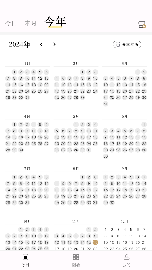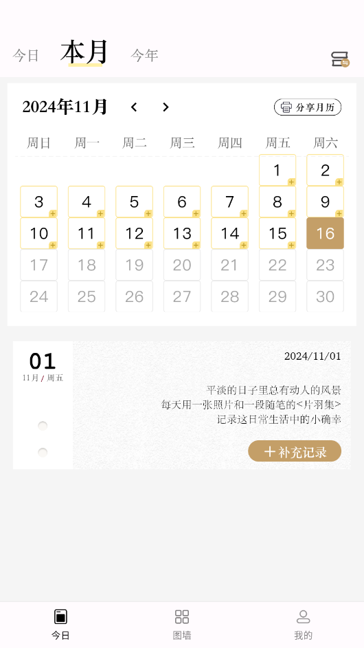 可以按月或按年回顾自己的日历记录,也能够随时进行补录;