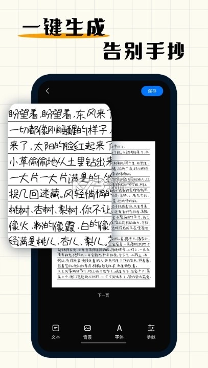 《手写模拟器》手机版现在免费提供一键生成手写内容的功能啦,不管是检讨书、手抄笔记还是手抄课本,都能轻松一键生成,而且效果特别逼真。手写字体、字间距这些参数都可以自由调整,甚至还能添加错字涂抹的效果,让生成的内容更贴近真实手写的感觉哦。
