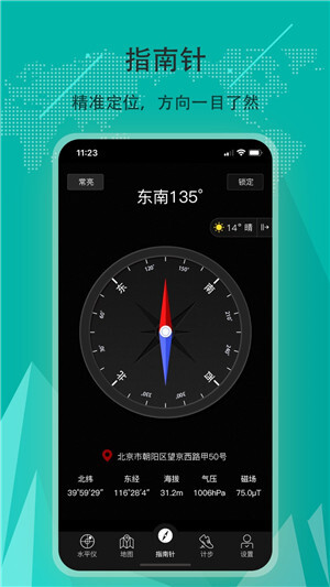 这款指南针能精准定位你的地理位置,无论身处何方都能清晰知晓;它支持2D平面图地图查看模式,同时提供实时路况信息与卫星图,实现了实景与地图的无缝结合;此外,还具备搜索附近地点以及智能联想搜索的功能,并且支持离线地图使用。
