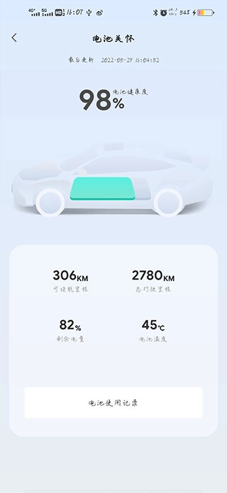 车主借助软件,还可以实时查看电池的使用记录,以及剩余续航里程、电池温度、总行驶里程等信息。