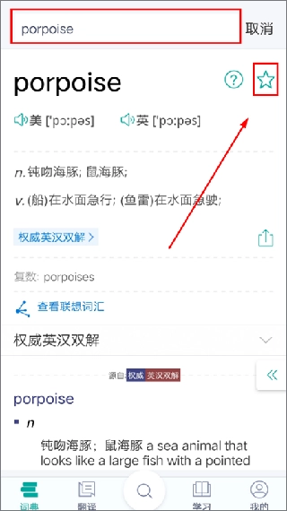 在搜索要查询的生词时,点击右上角的“☆”,就能将该生词添加到“我的生词本”中。
