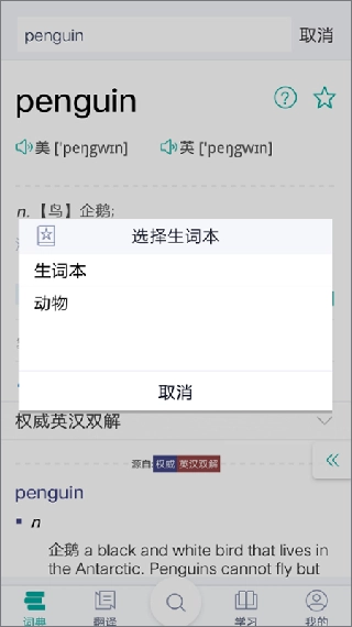 当你查询“penguin”这个词的时候,点击右上角的“☆”图标,系统会弹出“选择生词本”的对话框,此时只要选择“动物”单词表,就能完成添加操作了。