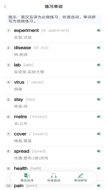 软件提供英译汉、汉译英、中英配对等多元学习模式,助力用户全方位强化词汇认知能力。借助听音选词功能,用户可在练习中训练听力,提升单词发音辨识水平;单词拼写测试,能帮助用户在记忆单词时及时纠正发音与拼写错误。学习过程中,所有陌生单词和答错的单词会反复出现,确保用户掌握单词时不存在知识遗漏。这样的设计让学习过程更高效、更系统化。