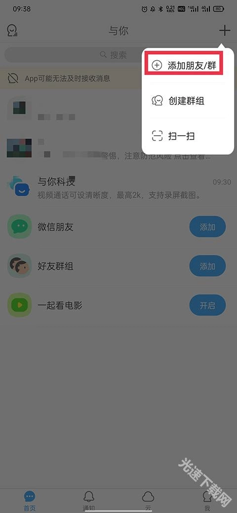 在下拉菜单里点击“添加朋友/群”;