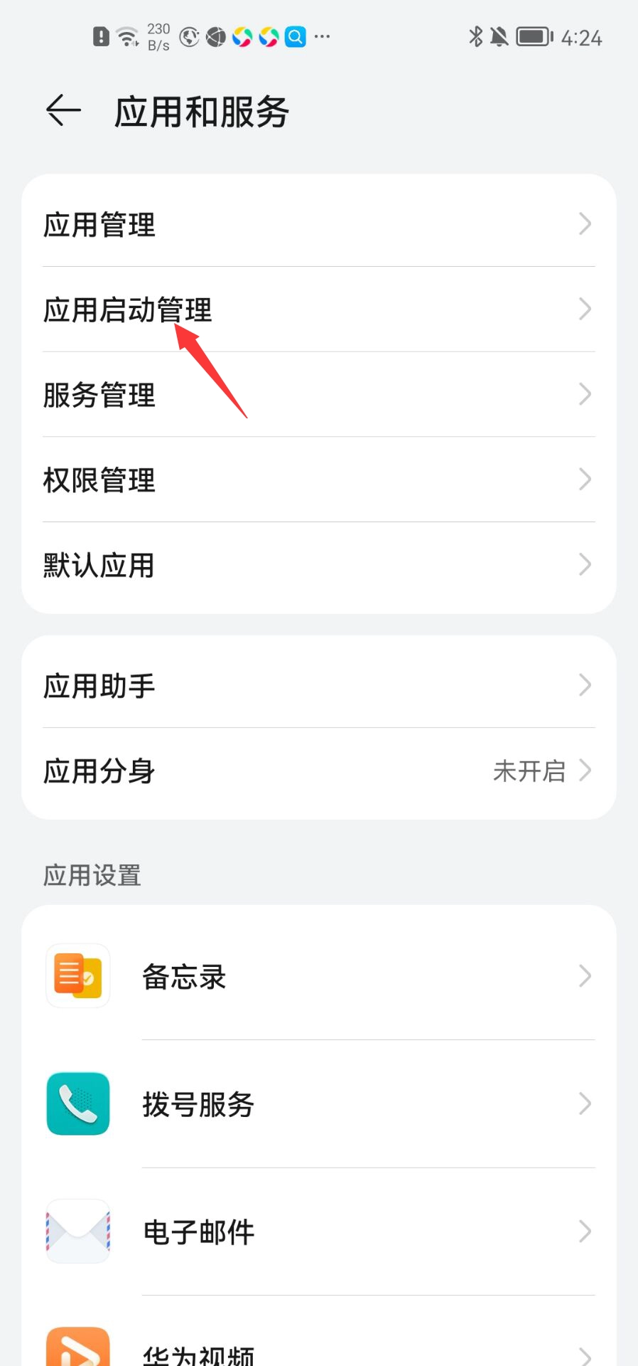 返回设置进入【应用和服务】,进入【应用启动管理】