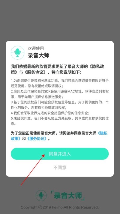 安装录音大师,同意隐私协议后进入。