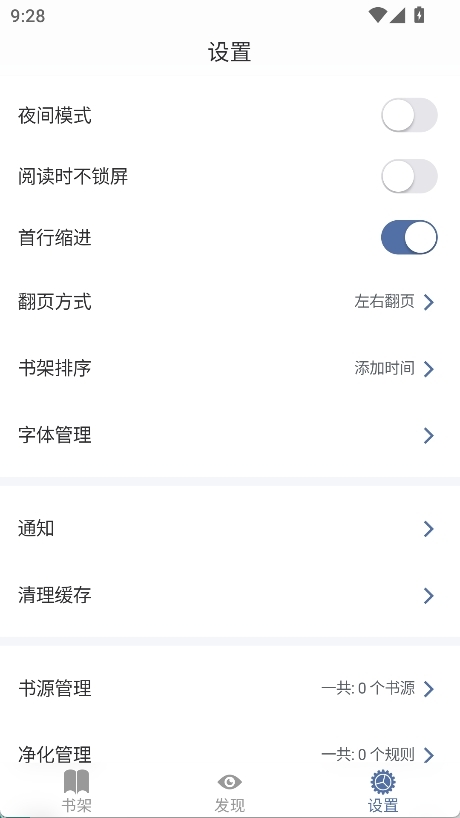 在“设置”界面里,用户能够开启或关闭夜间模式,还能调整翻页的方式以及调节字体大小,此外还有其他多种小说阅读相关的功能设置可供操作。
