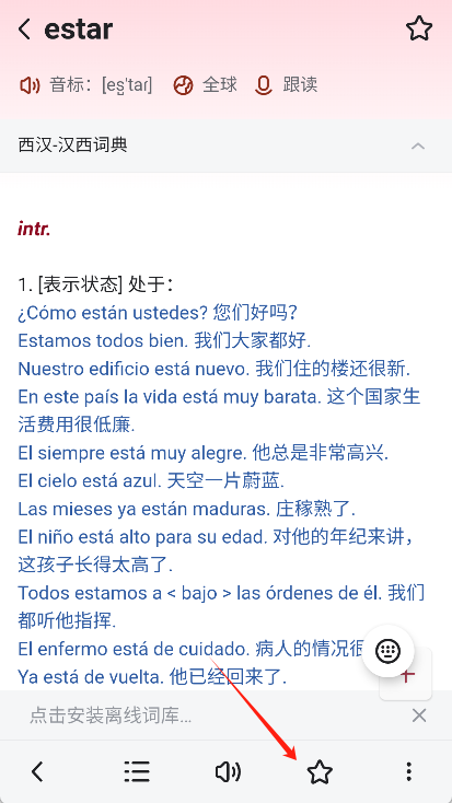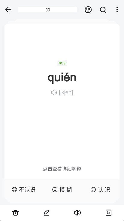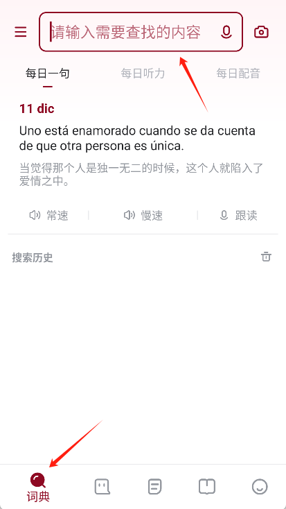 你可以在词典界面输入生词来进行翻译和学习,对应的译文会在下方的界面中显示出来。