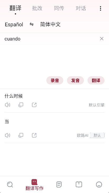 西语助手是一款十分全面的语言学习词典类软件,能助力我们提升自身的西班牙语水平,达成轻松学习西语的目标。它还配备了多种词典供大家自主查询,像汉西词典、西西词典、西英词典等都包含在内,词汇量相当丰富,给出的翻译释义也很专业可靠。另外,软件提供了多种动词变位反查功能,能让我们更轻松地掌握复杂的动词变位规则。要是觉得逐个输入文字比较繁琐,还可以通过拍照或者语音的方式来进行翻译呢!