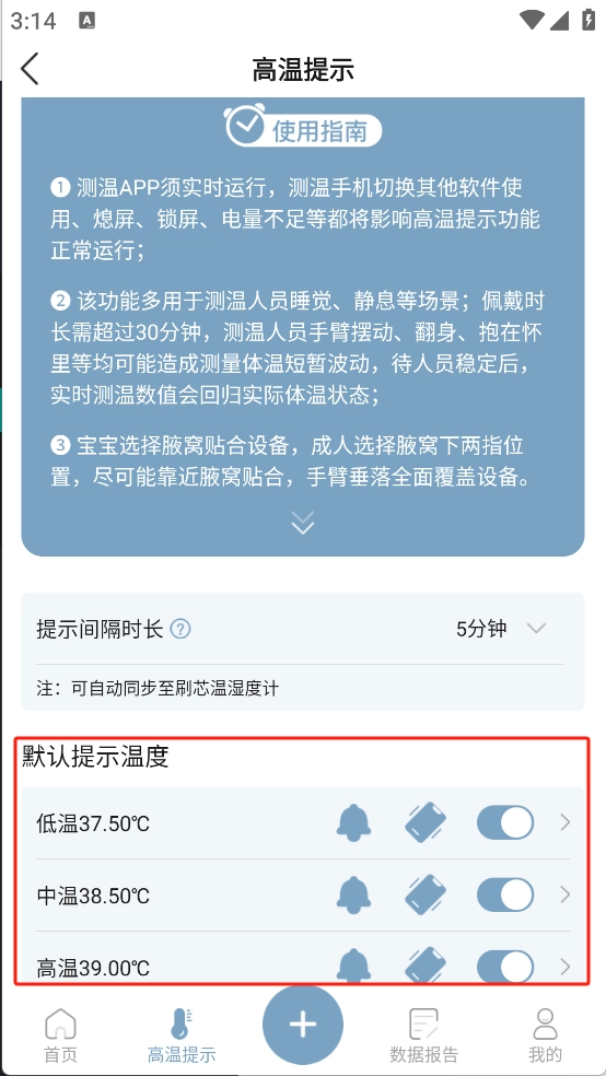 在软件里能够设置温度提醒的阈值,一旦体温达到所设定的温度,手机就会弹出高温提示。
