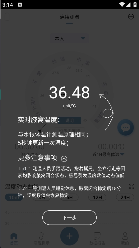 连接成功后,用胶贴把无线电子体温计贴在腋下,点击开始测温,即可实时监测体温。