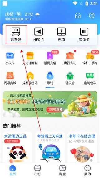 首先要打开天府通应用,接着在首页找到并点击“乘车码”这个功能选项。