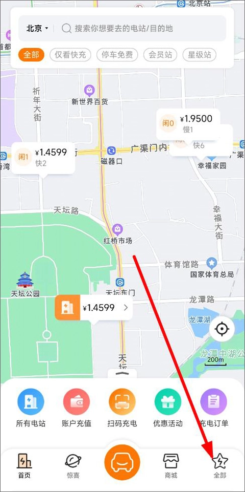 打开星星充电桩应用,进入登录后的首页,查看当前定位周边的空闲充电桩与电站,以及账户充值、扫码充电、订单等功能,最后点击“全部”选项。