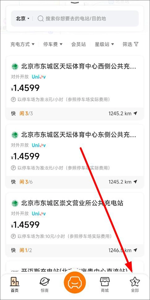 打开星星充电桩应用,进入登录后的首页,查看当前城市的闲置充电桩,然后点击“全部”选项。