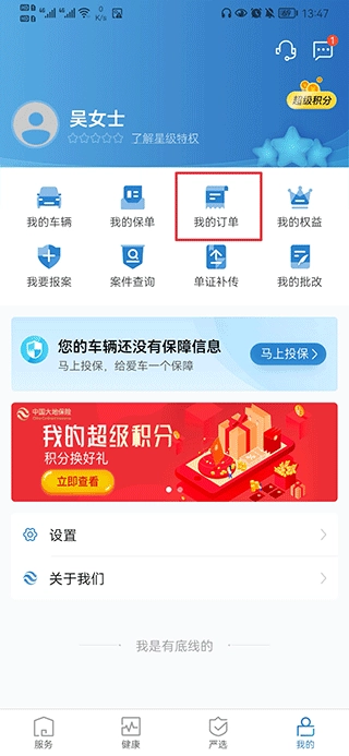 在这里,用户通过中国大地超A保险,不仅能在平台上直接查询各类保险产品、在线咨询办理业务、查看电子保单等服务,还可享受道路救援、优惠洗车、违章查询、罚单代缴等车辆相关服务,以及医院预约挂号、家政服务等生活类服务。此外,用户更能参与涵盖数码产品、话费充值、电子卡券、幸运抽奖等丰富品类的线上活动。我们为用户全方位提供贴心优质的服务,你还在犹豫什么?赶快来体验吧!
