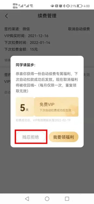 商家为了阻止你取消自动续费,可能会推出一些诱人的优惠活动,遇到这种情况不用理会,直接点击【残忍拒绝】按钮即可。要是之后有需要使用VIP功能的时候,再临时开通就好,开通完成后记得按照之前的步骤把自动续费功能关闭。