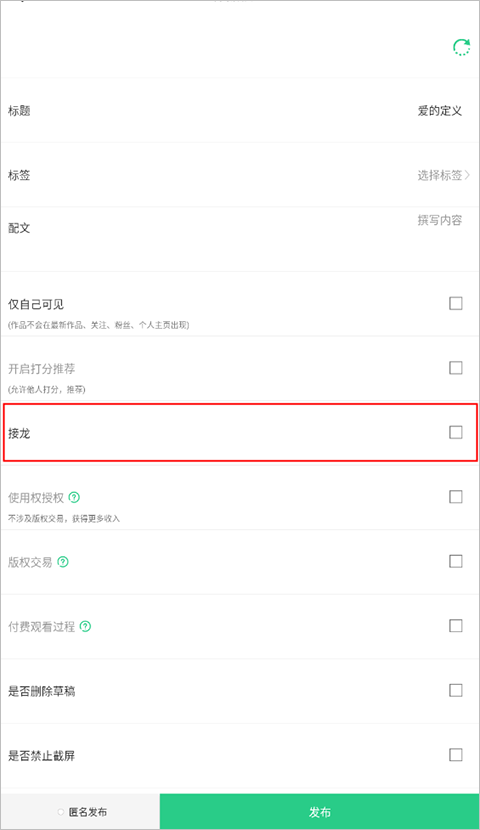 进入作品信息页面后,勾选下方的“接龙(合绘)”选项,再点击“发布”按钮。发布成功就意味着你已经完成了作品上传哦!