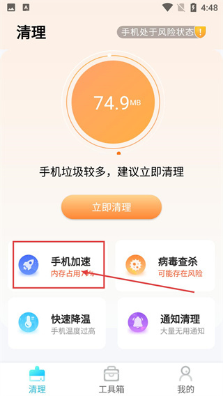 进入清理页面后,能看到手机垃圾量显示为74.9MB,同时会有“手机垃圾较多,建议立即清理”的提示;点击【手机加速】选项,即可启动加速流程。