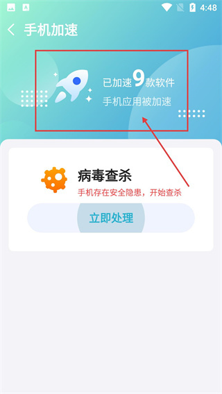 4、加速操作完成并返回页面后,会看到“已加速9款软件”的提示,此外还能找到【病毒查杀】等其他优化功能选项。