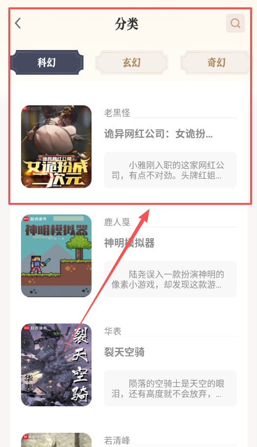 在首页点击顶部的分类按钮后,会展开更为详细的图书分类列表,其中包含科幻、玄幻等各类细分标签。