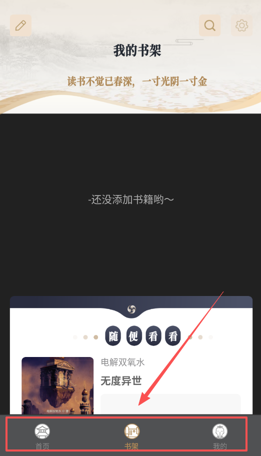 3、书架功能在底部导航栏的中间位置,新用户第一次进入时会看到“还没添加书籍”的提示。