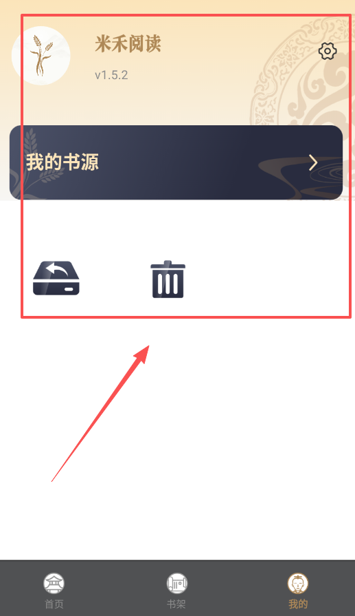 4、个人中心位于右下角的“我的”标签页,在该页面中,您能够查看软件版本号v1.5.2,同时也可以对自定义书源设置进行管理。